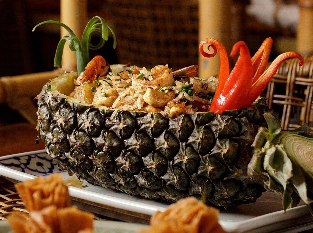 Koh Pad Goong Subparrod – Arroz frito servido no abacaxi com camarão, passas de uva, abacaxi e castanhas de caju (prato já tradicional no cardápio do restaurante Koh Pee Pee).
