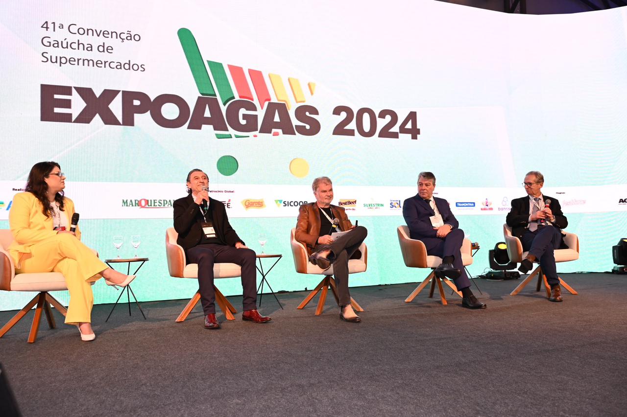 41ª Convenção Gaúcha de Supermercados engajou a plateia em um bate-papo inspirado no mote que marca esta edição do evento: “Superação: essa é a nossa marca”. Com mediação do vice-presidente e comunicador da Rede Pampa, Paulo Sérgio Pinto, as lideranças que estiveram no palco, na manhã desta terça-feira (20), para falar sobre sobre tema foram o presidente do Banco do Estado do Rio Grande do Sul (Banrisul), Fernando Lemos; o CEO do Grupo Di Paolo e presidente do Sindicato de Hospedagem e Alimentação de Porto Alegre e Região (Sindha), Paulo Geremia; a supermercadista e presidente do Agas Jovem, Roberta Barreto; e o presidente do Grupo Lebes, Otelmo Drebes.