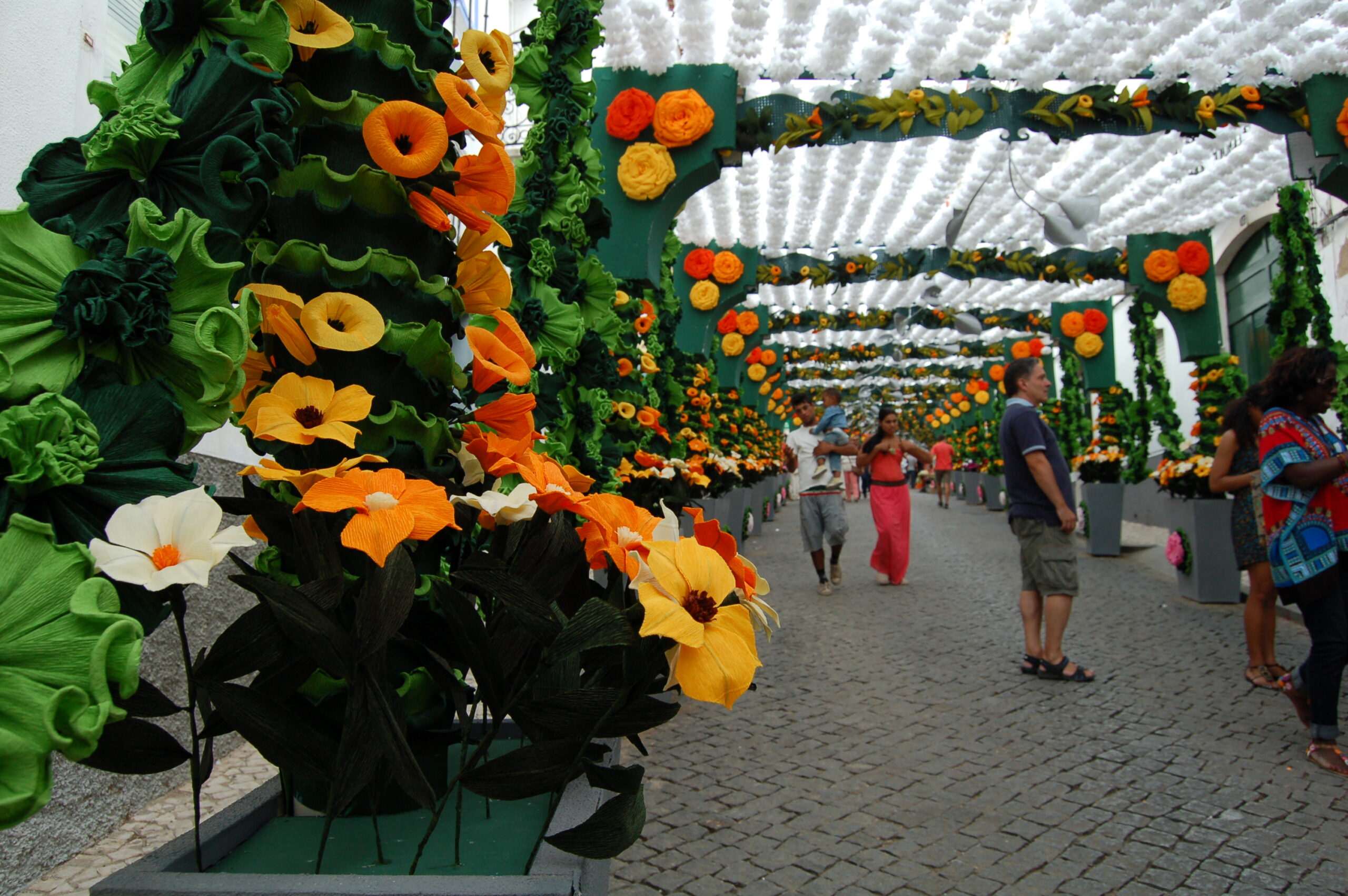 Meses antes do evento, casas e garagens se transformam em ateliês improvisados, onde os moradores se reúnem para produzir rosas, cravos, dálias e girassóis de papel. Para dar vida às flores decorativas, são utilizadas mais de 30 toneladas de materiais, incluindo grandes quantidades de papel, cartão, cartolinas, cola e arame, que depois se transformam em verdadeiros jardins suspensos a céu aberto. Mantida desde 1893, essa arte atravessa gerações e reflete a dedicação e o orgulho dos moradores com a tradição das festas.